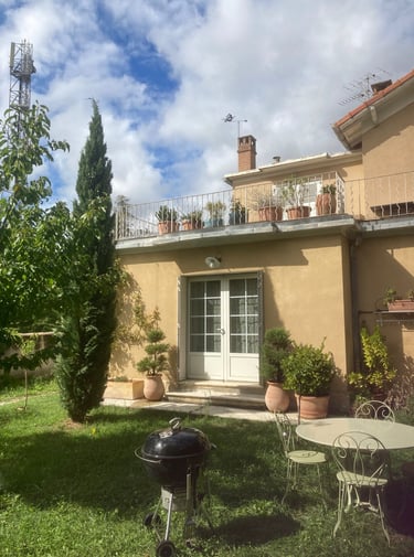 Das Haus liegt gegenüber einem 400 m² großen Garten voller Blumen und Bäumen.